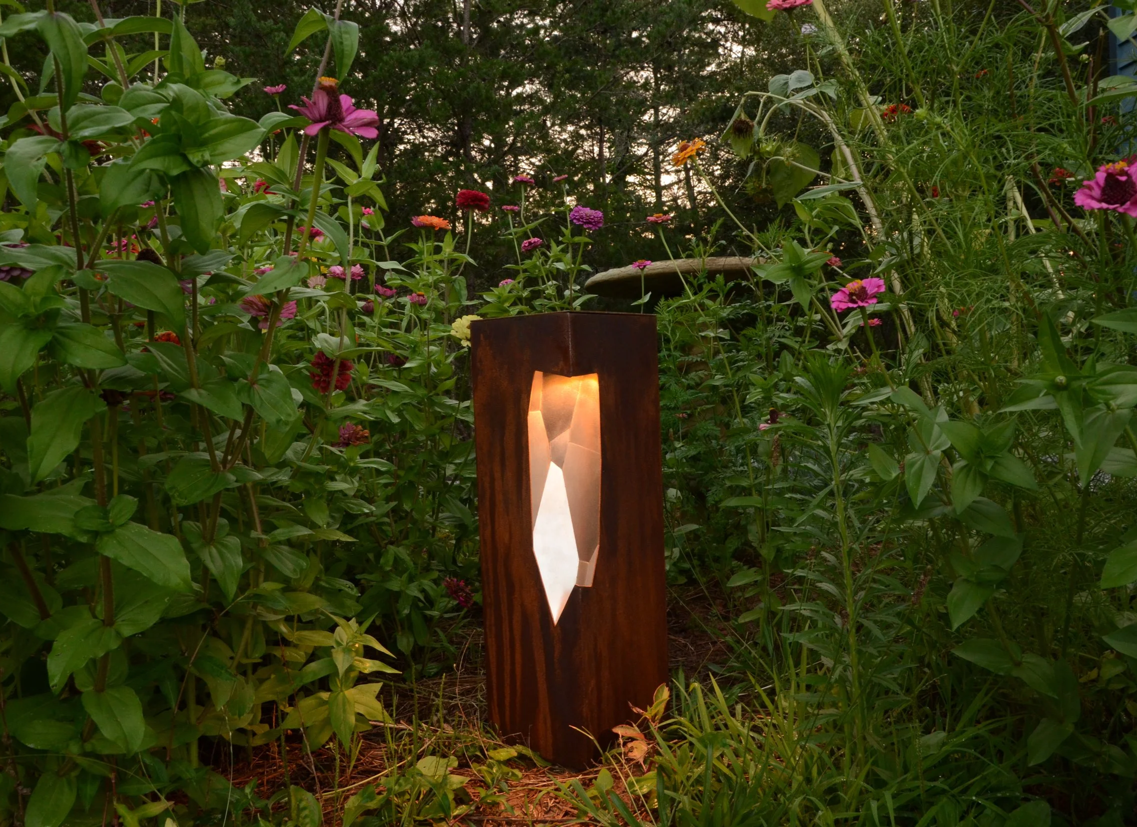 The Faceted Beacons are illuminated outdoor sculptures that blend the raw with the refined and have presence both day and night.