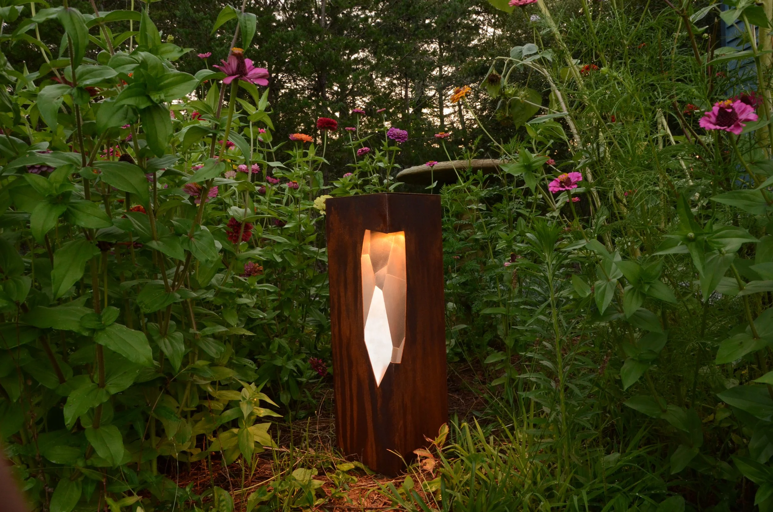 The Faceted Beacons are illuminated outdoor sculptures that blend the raw with the refined and have presence both day and night.